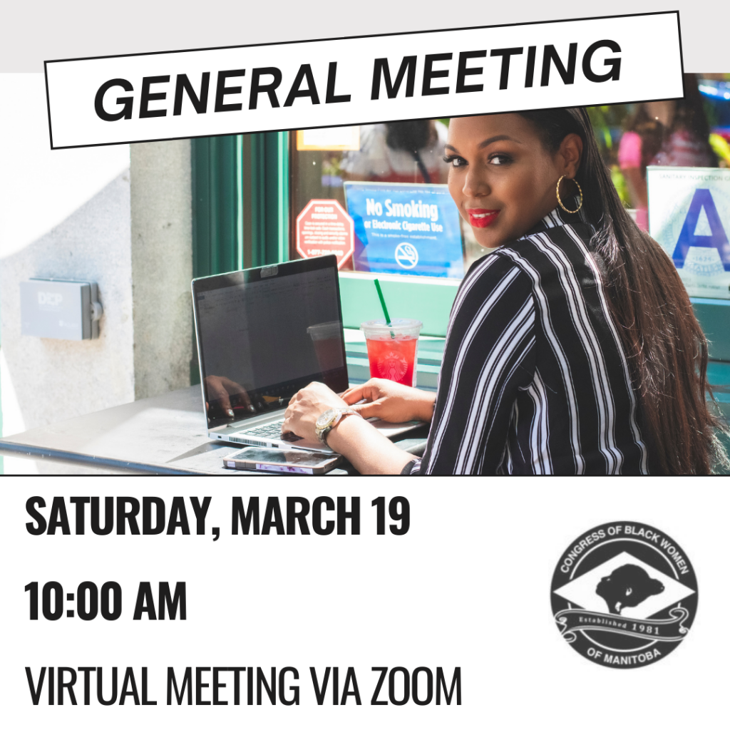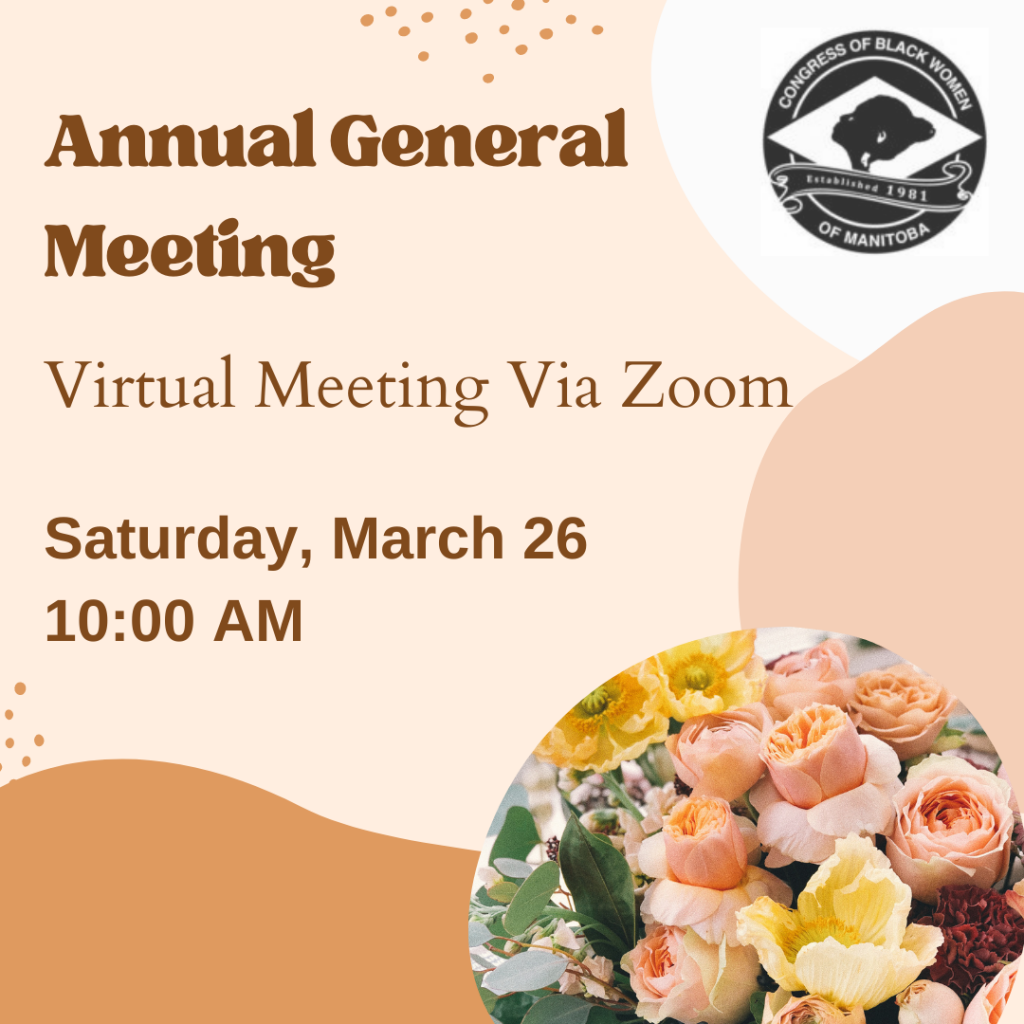 To abide by provincial and regional health regulations in response to COVID-19 the Congress of Black Women of Manitoba presents all events virtually using the Zoom platform. Please note that this is subject to change as regulations change. After registering, you will receive a confirmation email containing information about joining the event. Please log in 5 minutes before the session starts.